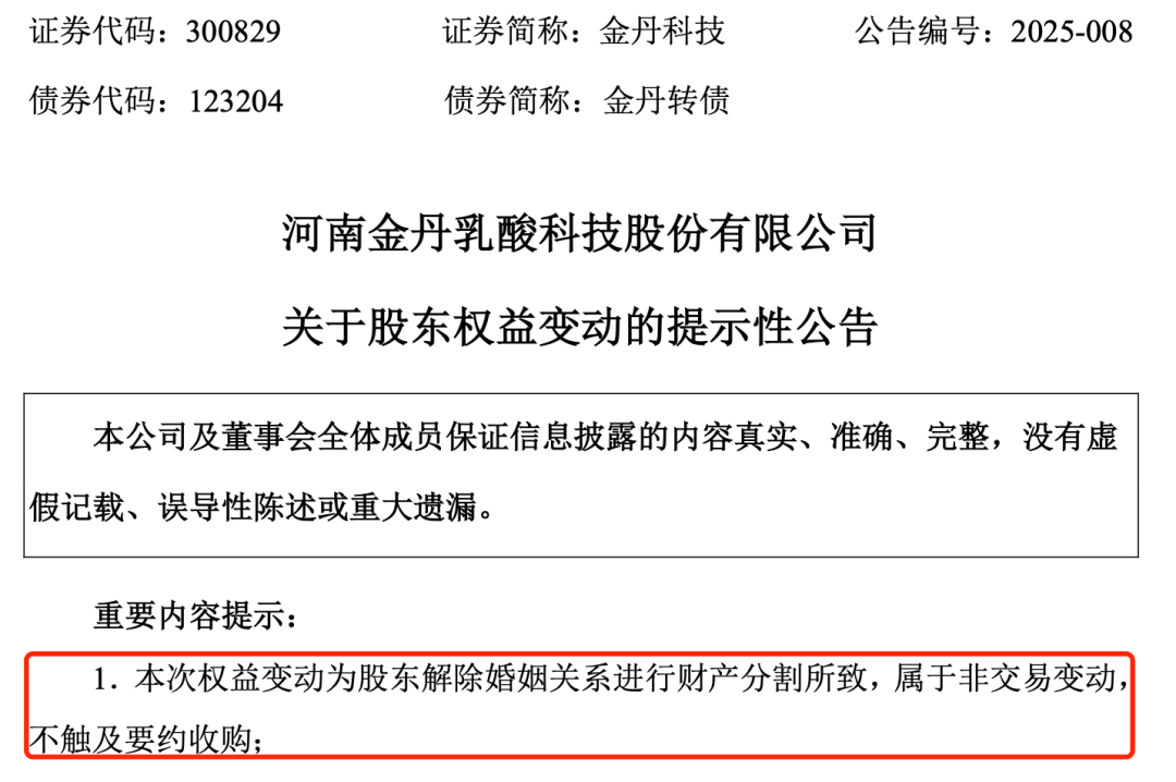 1月22日晚间,金丹科技发布了《关于股东权益变动的提示性公告》。公司称,近日收到控股股东、实际控制人、董事长张鹏先生的通知,获悉张鹏先生与李中民女士经友好协商,已办理解除婚姻关系手续,并就股份分割等事宜作出相关安排。
